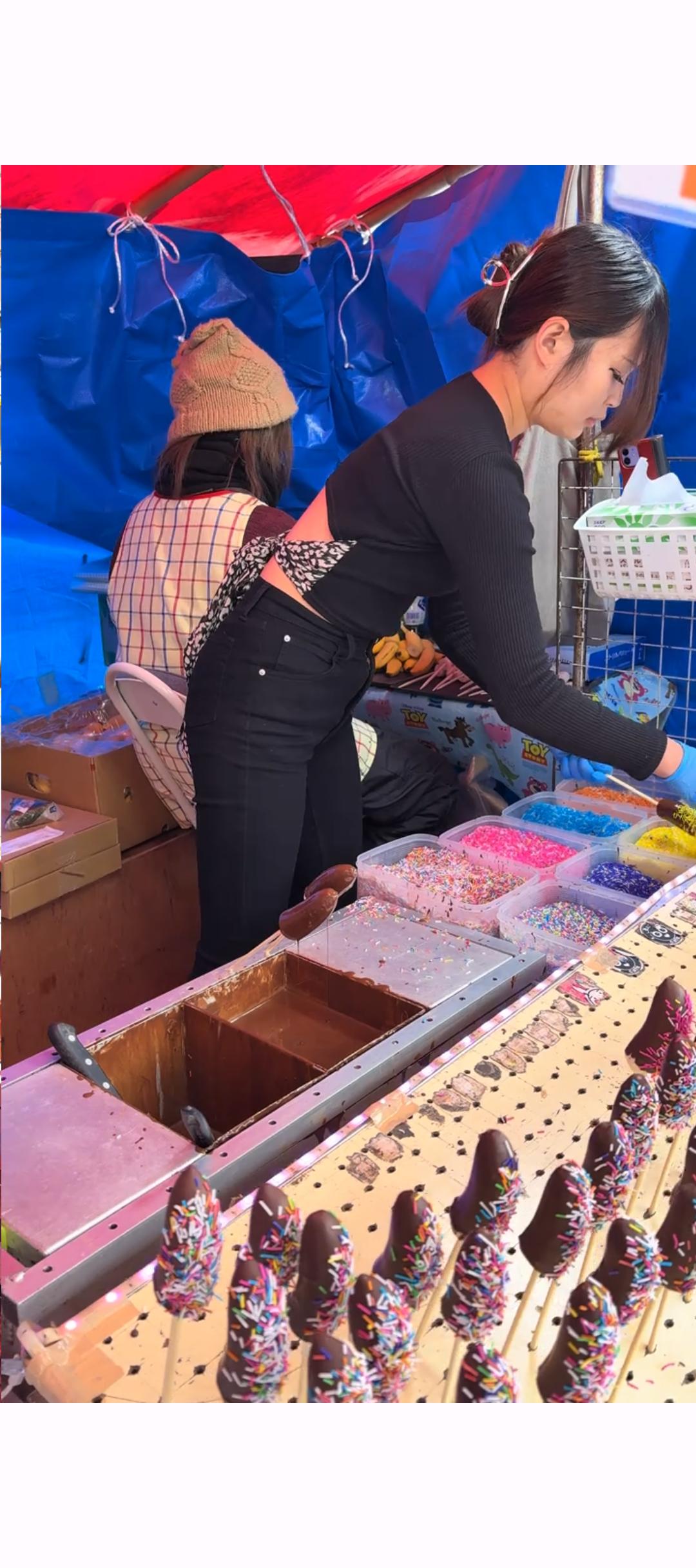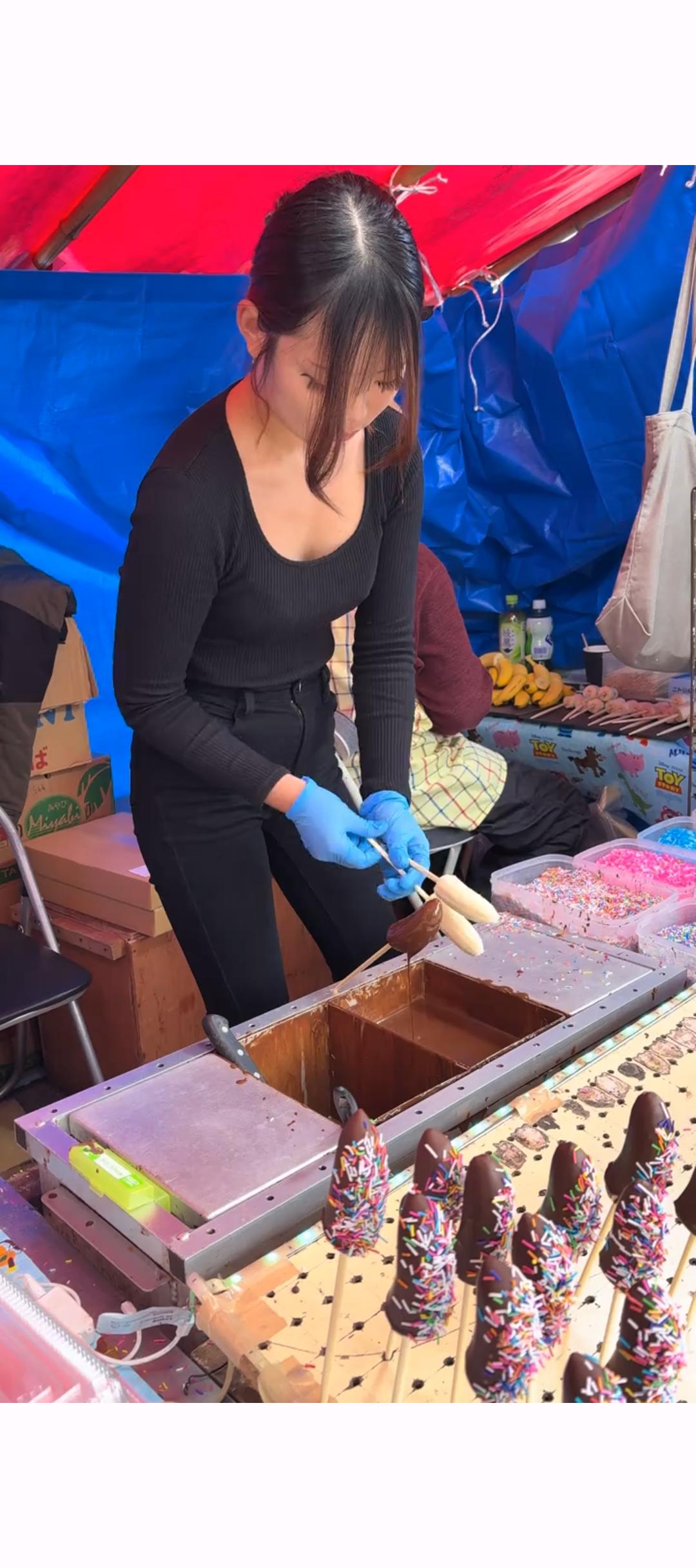 【画像】ピチピチギャルがチョコバナナを作ってくれる屋台wwwwwww